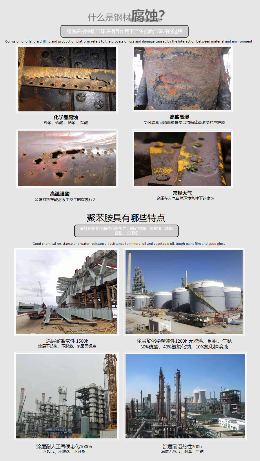 無溶劑環(huán)氧/聚氨酯體系,致密涂膜,耐酸、堿、鹽、油等化學(xué)介質(zhì)。