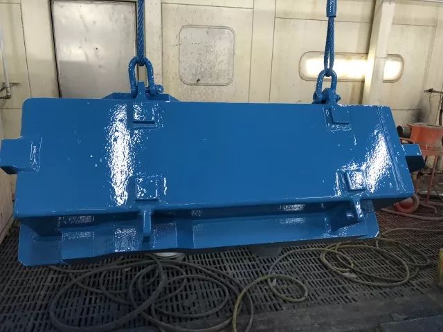 首批次無溶劑涂料在振華南通傳動公司的齒輪箱上進(jìn)行了施工試點,施工參數(shù)設(shè)定為底漆80μm,中漆150μm,面漆80μm,在不改變生產(chǎn)線現(xiàn)有單組份泵設(shè)備參數(shù)的情況下,順利的完成了三道涂料的施工。涂料施工混合壽命超過2小時。同時,以其無刺激性涂料施工味道的優(yōu)勢獲得了施工工人的好評和認(rèn)可。整體重防腐涂層體系已經(jīng)通過實驗室1500小時以上鹽霧測試和150天以上的耐化學(xué)品測試,整體性能優(yōu)異。