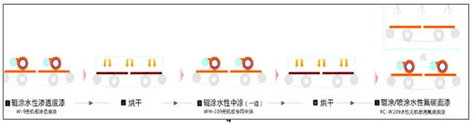水泥纖維板------水性底漆------水性中涂漆------水性氟碳涂料----烘烤----包裝。